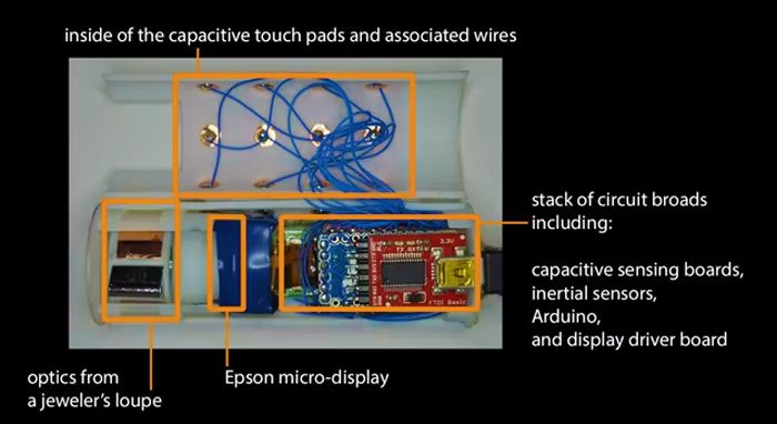 The device includes a proximity sensor to tell when it’s being held in front of your eye, and a magnetometer, gyroscope, and accelerometer help determine its orientation and measure changes so the display can always appear upright to the user. The current version of the Loupe is also tethered to a computer running Android and an Arduino microcontroller.
